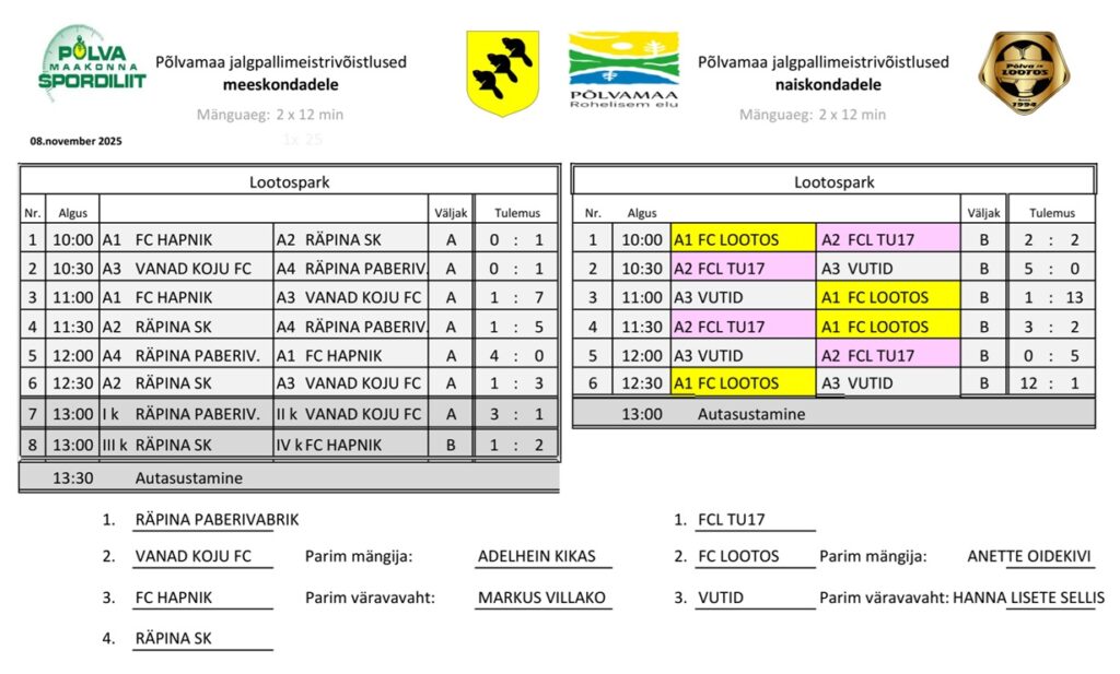 8.novembril selgitati Lootospargis välja Põlva maakonna jalgpallimeistrid naiste ja meeste arvestuses. Naiste arvestuses tuli võitjaks Lootose U17 noortevõistkond ja meeste arvestuses Räpina Paberivabrik.