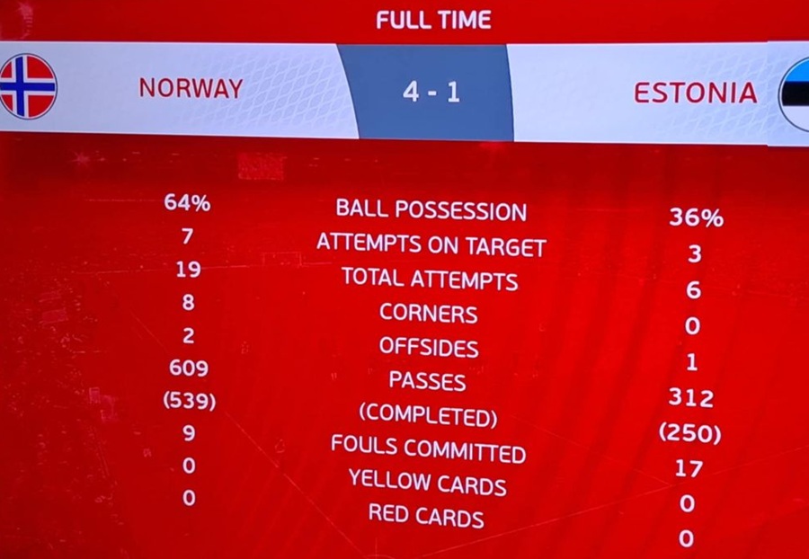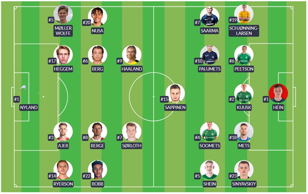 väravad: 50`, 52`Alexander Sørloth, 56`, 62`Erling Haaland – 64`Robi Saarma