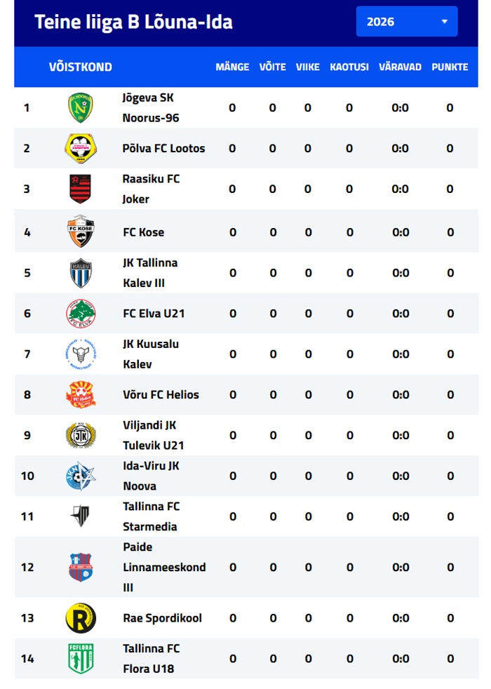 Meeskonna koosseis hooajal 2026 (sulgudes mängud/väravad)