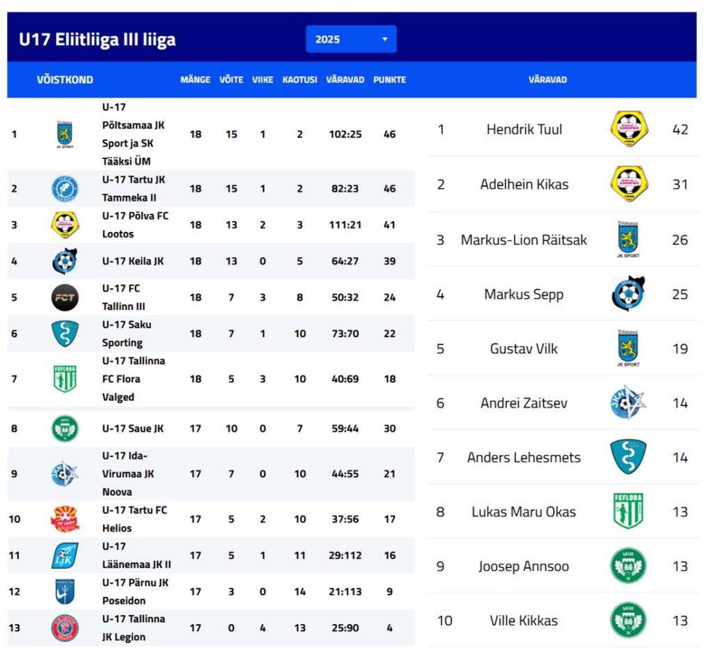 Liigatabel ja mängude tulemused U17 Eliitliiga III liiga lehel